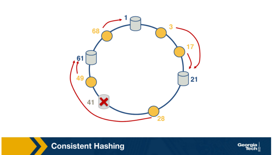 Consistent hashing is an example of distributed has table and requires relatively little movement when nodes join and leave the system. The main idea is that servers and the content objects are mapped to the same ID space.