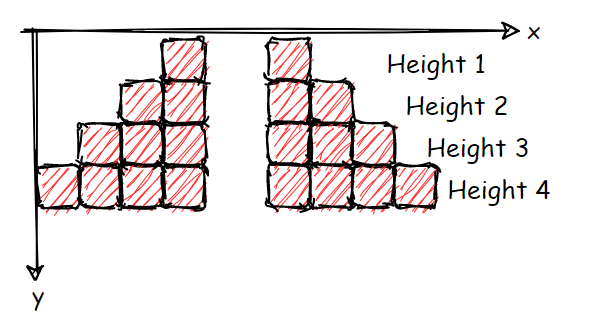 It is important to realize how we define height. To do that imagine a coordinate system with its y axis at the top of the pyramid and its positive direction towards the bottom of the pyramid. Also, note that height starts at 1.
