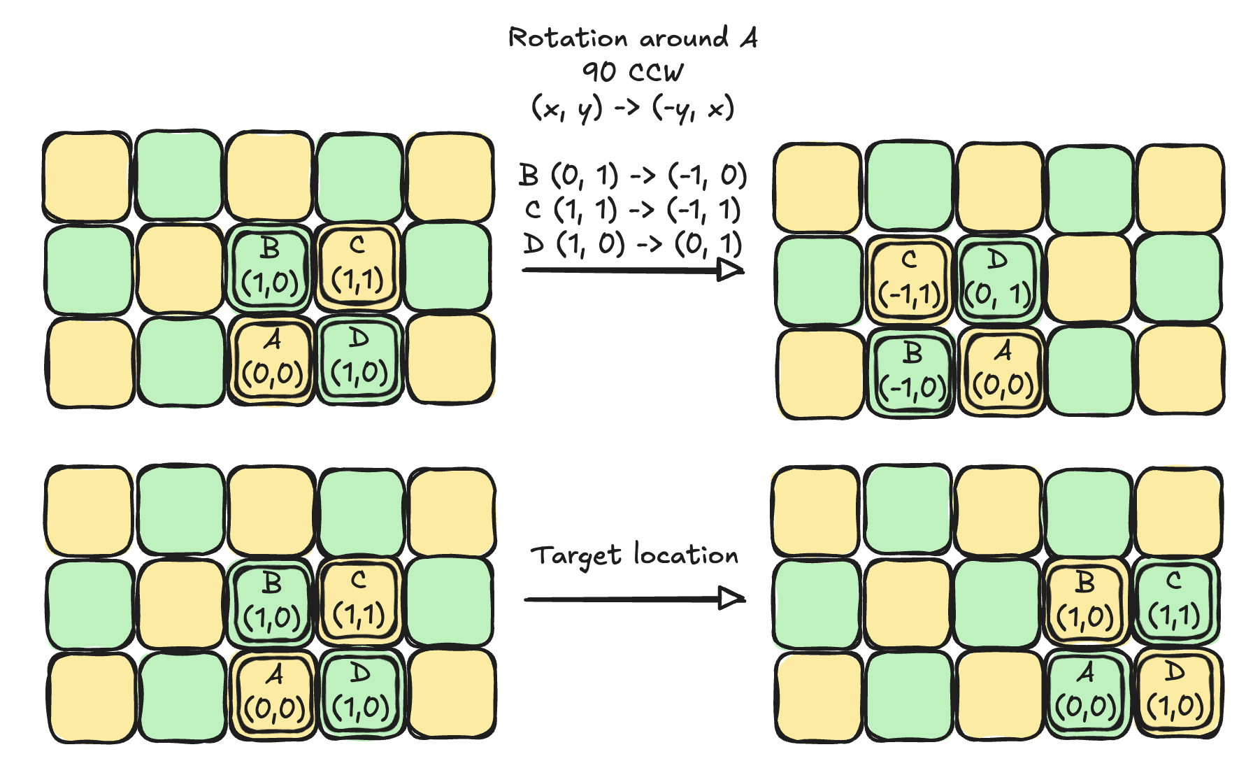 To reach the end goal we will need to shift by 1 in the x direction in which case (x + y) mod 2 != 0 . This means no sequence of rotations is possible to reach the target location.