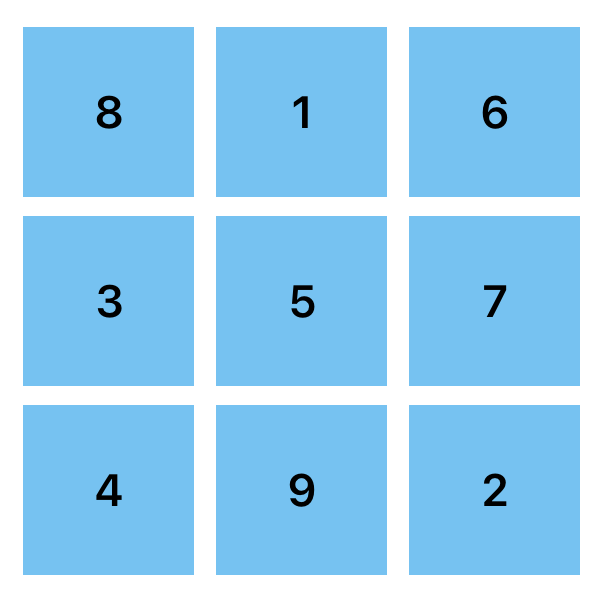 Let’s try to find an analogy. A 3x3 magic square uses the numbers from 1 to 9, and every row, column, and main diagonal sums to 15.