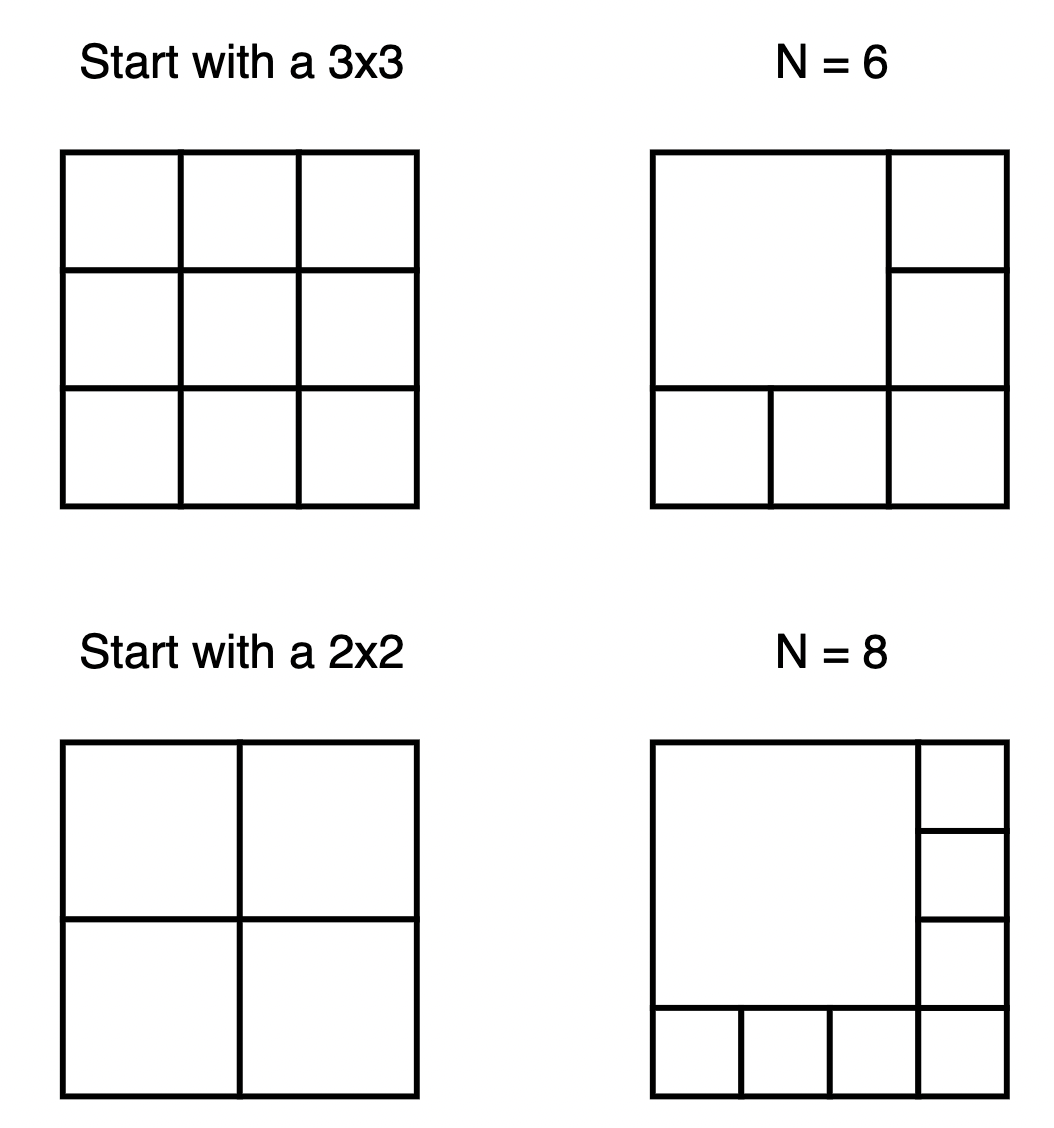 - N=2, 3: After a few sketches, it seems impossible to dissect a square into 2 or 3 smaller squares. Let’s conjecture that 2 and 3 are not nice.